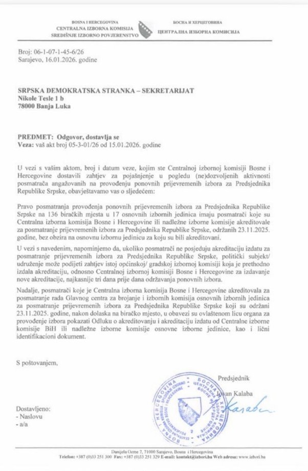 CIK BIH Odijen zahtjev SDS-a za registraciju novih posmatrača na ponovljenim izborima 8. februara