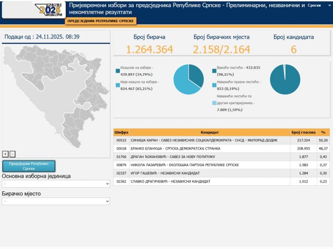 Prema posljednjem izvještaju CIK, na osnovu 99,72 odsto obrađenih biračkih mjesta, kandidat SNSD-a Siniša Karan osvojio je 217.324 glasova, ili 50,30 odsto na prijevremenim predsjedničkim izborima u Republici Srpskoj.