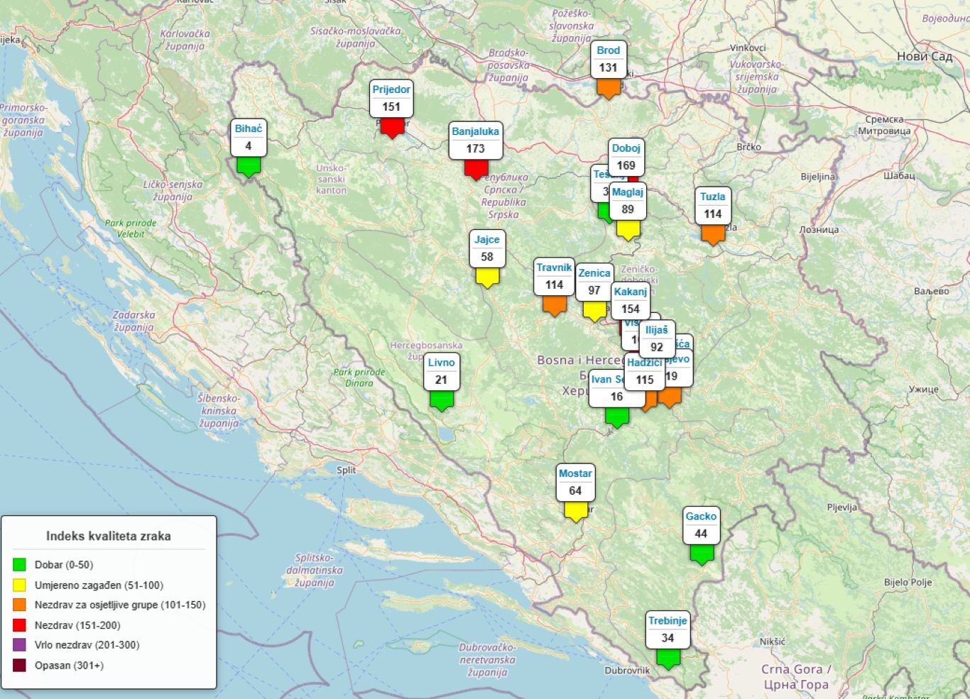 Kvalitet vazduha sa indeksom od nula do 50 je dobar, od 51 do 100 umjereno zagađen, od 101 do 150 nezdrav za osjetljive grupe stanovništva, od 151 do 200 nezdrav, od 201 do 300 vrlo nezdrav i više od 300 opasan po zdravlje.