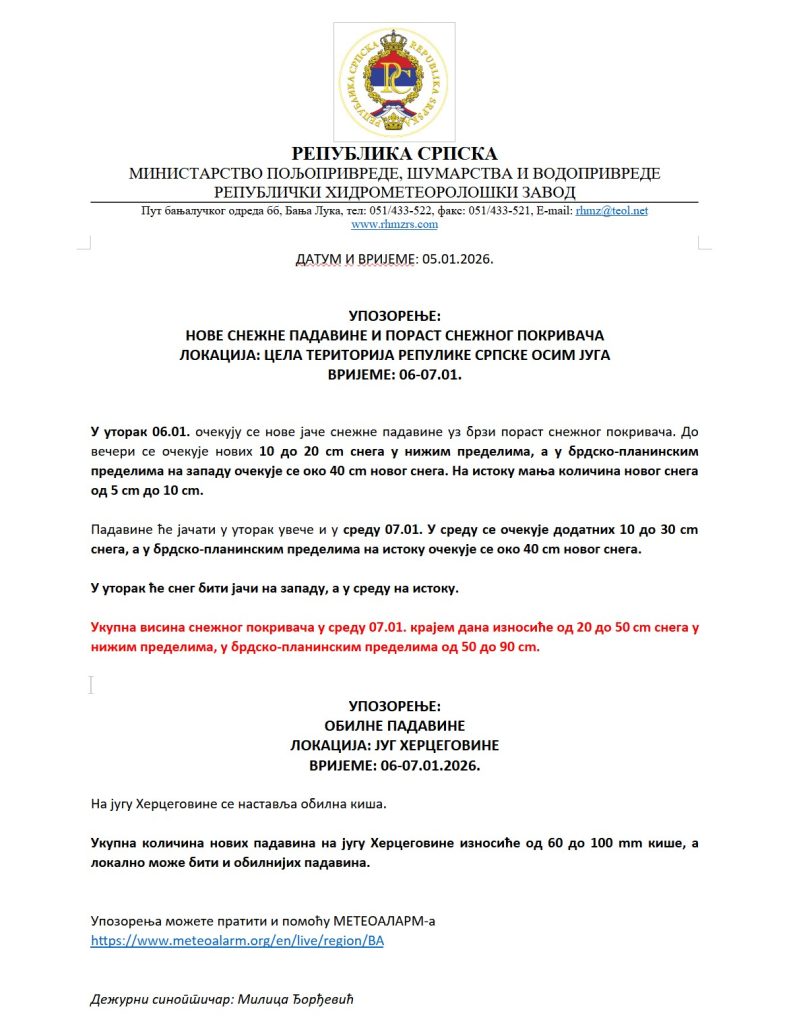 Ukupna visina snježnog pokrivača u srijedu krajem dana iznosiće od 20 do 50 cm snijega u nižim predjelima, u brdsko-planinskim predjelima od 50 do 90 cm.