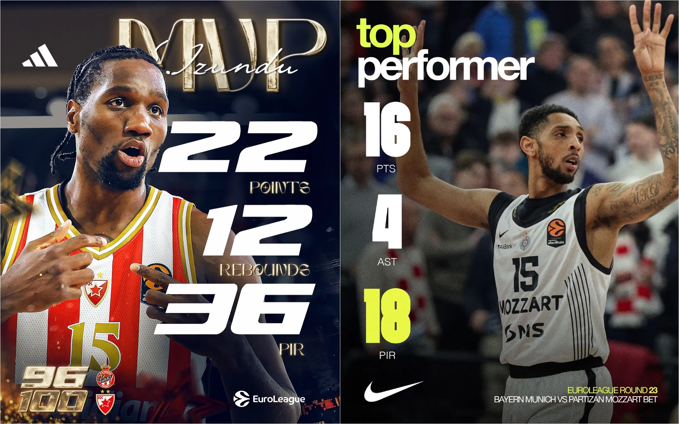 Ebuka Izundu bio je oslonac Zvezde tokom regularnog dijela utakmice i najefikasniji pojedinac. Ubacio je 22 poena, što mu je rekord karijere, a meč je završio sa indeksom korisnosti 36.