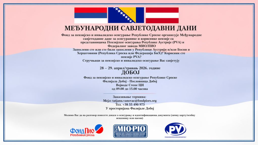 Fond za penzijsko i invalidsko osiguranje Republike Srpske domaćin je Međunarodnih savjetodavnih dana koji će biti održani 28. i 29. aprila 2026. godine u Doboju. Početak je zakazan za 9.00 časova.