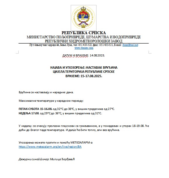 Odjeljenje za civilnu zaštitu grada Doboja najavilo je nastavak vrućina na teritoriji cijele Republike Srpske od 15. do 17. avgusta 2025.
