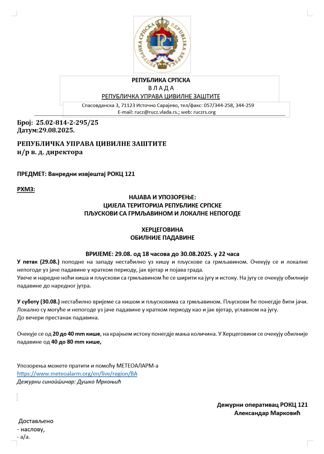 U petak (29.08.2025.) popodne na zapadu nestabilno uz kišu i pljuskove sa grmljavinom. Očekuju se i lokalne nepogode uz jače padavine u kratkom periodu, jak vjetar i pojava grada. Uveče i naredne noći kiša i pljuskovi sa grmljavinom će se širiti ka jugu i istoku. Na jugu se očekuju obilnije padavine do narednog jutra.