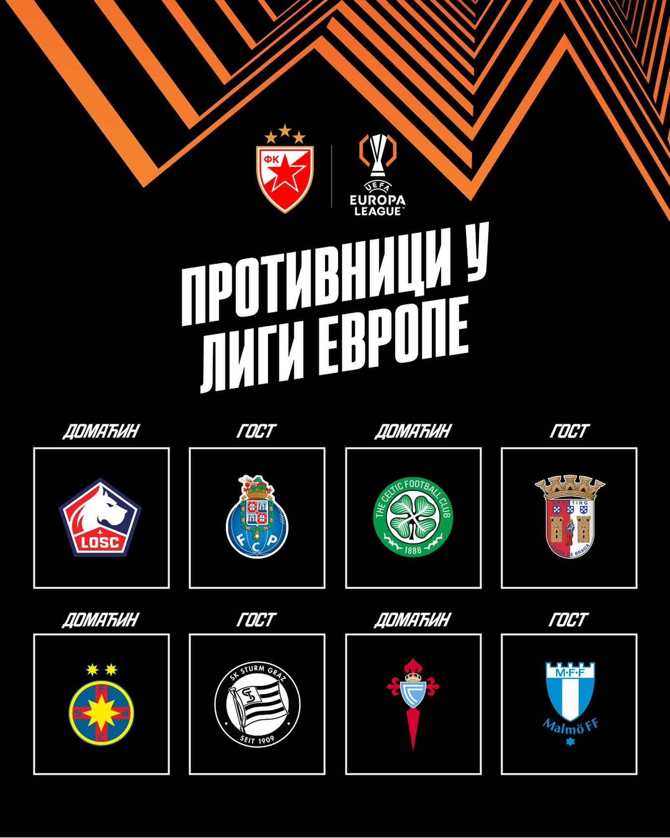 Јedini predstavnik Srbije u evropskim takmičenjima – Crvena zvezda igraće u Ligi Evrope protiv Porta, Lila, Seltika, FCSB-a, Selte, Brage, Šturma i Malmea.